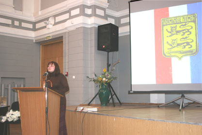 Madame Lioudmila Semionova du Centre d'education patriotique a annonce les noms des laureats du concours "Normandie-Niemen - le symbole eternel de l'amitie franco-russe". |